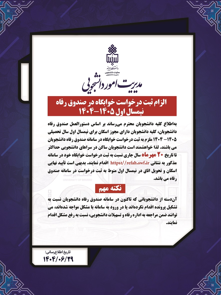الزام ثبت درخواست خوابگاه در صندوق رفاه نیمسال اول ۱۴۰۵-۱۴۰۴ ۳۱ شهریور ۱۴۰۴ | ۱۰:۱۵ کد : ۳۱۸۵۵ اطلاعیه اطلاعیههای مهم ارسال به دیگران نام شما ایمیل شما ایمیل دریافتکننده ارسال انصراف تعداد بازدید:۹۲۱