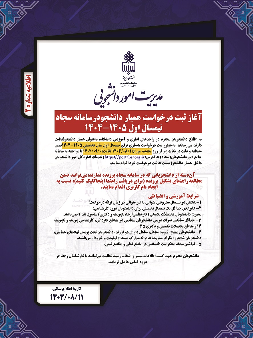 آغاز ثبت درخواست همیار دانشجو درسامانه سجاد نیمسال اول ۱۴۰۵-۱۴۰۴ ۱۱ آبان ۱۴۰۴ | ۱۰:۲۲ کد : ۳۲۳۰۹ اطلاعیه ارسال به دیگران نام شما ایمیل شما ایمیل دریافتکننده ارسال انصراف تعداد بازدید:۱۷۷ برای دریافت دفترچه راهنما ثبت نام اینجا کلیک کنید.