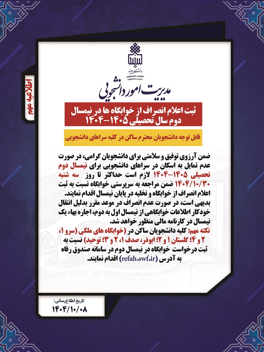 ثبت اعلام انصراف از خوابگاه ها در نیمسال دوم سال تحصیلی 1405-1404 ۰۸ دی ۱۴۰۴ | ۱۳:۲۶ کد : ۳۳۱۱۲ اطلاعیه اطلاعیههای مهم ارسال به دیگران نام شما ایمیل شما ایمیل دریافتکننده ارسال انصراف تعداد بازدید:۲۷۹