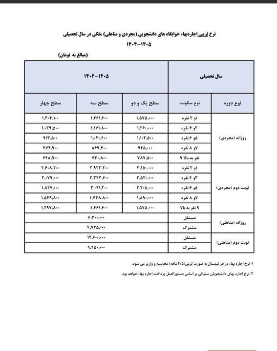 | 3 | نرخ ماهیانه اجاره بهای سراهای دانشجویی )مجردی و متاهلی( در سال تحصیلی 1405 - 1404)نیمسال اول، دوم و تابستان( | دریافت |