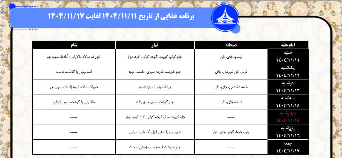 برنامه غذایی جاری تعداد بازدید:۵۰۴۲۸ ارسال به دیگران نام شما ایمیل شما ایمیل دریافتکننده ارسال انصراف
